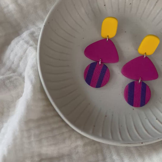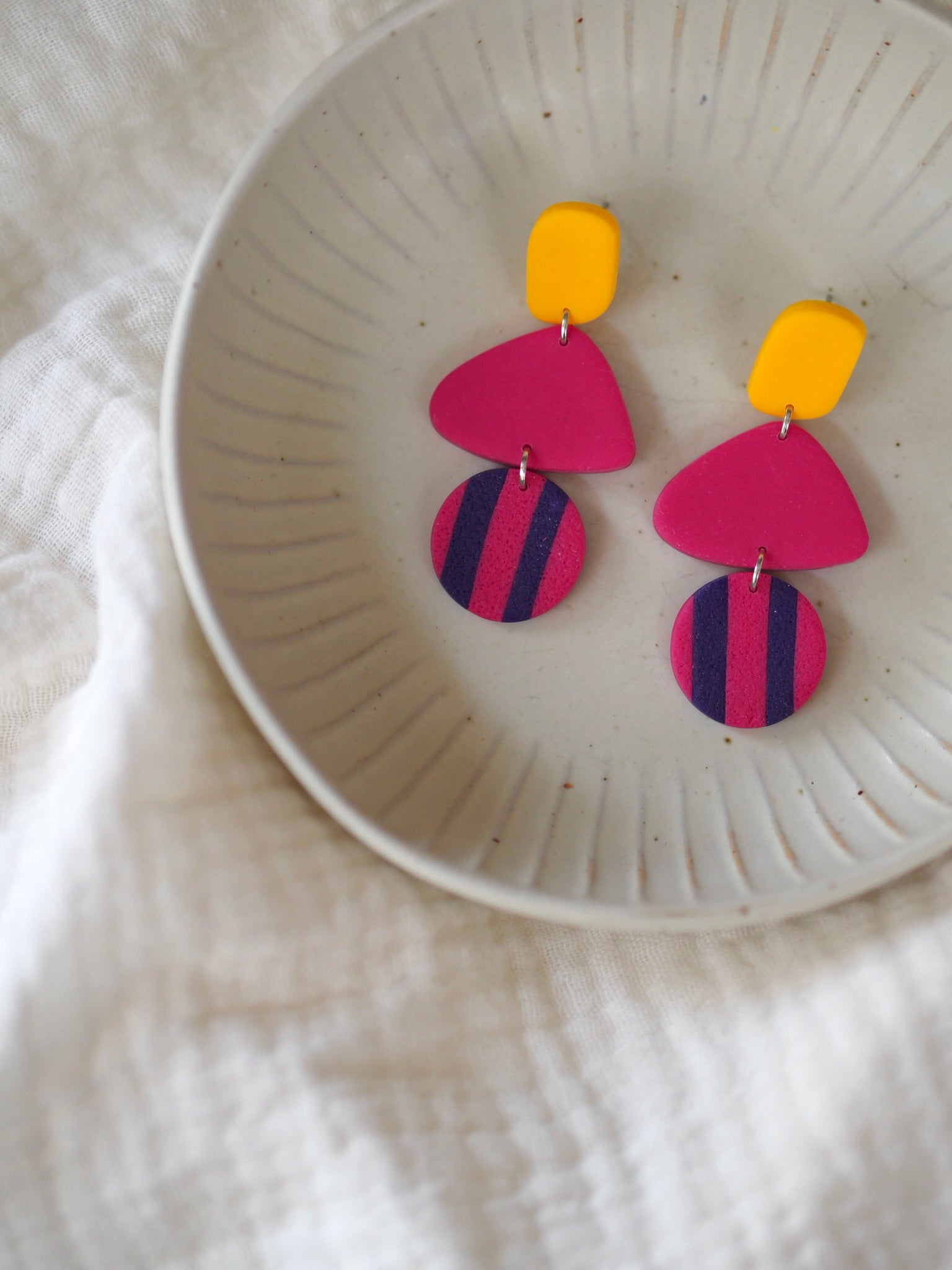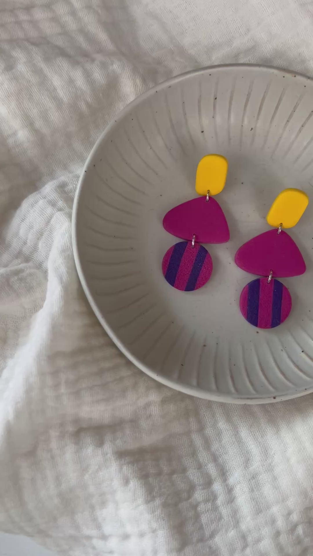 "Verleihe deinem Outfit einen Hauch von Farbe mit unseren Polymerton Ohrringen in Gelb, Lila und Pink! Die drei einzigartigen Ausstechformen in Kombination mit den goldenen Biegeringen und Steckern machen diese Ohrringe zu einem wahren Hingucker. Lass dich von der Vielfalt und dem besonderen Design begeistern!"